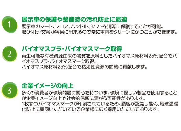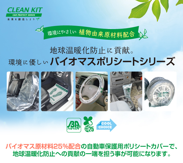 | バイオマス ポップアップ式フロント座席用ポリシートカバー | バイオマス ロール式フロア保護マット | |